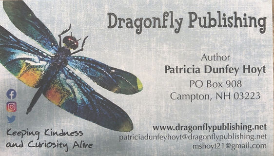 Dragonfly Publishing is a self-publishing service providing Children's Literature stories. Books by author Patricia Dunfey Hoyt can be purchased through this website by clicking on each book or item. The author Patricia hopes you will enjoy reading and interacting with these stories with your children. Help "Keep Kindness & Curiosity Alive," while learning and having fun while using your creativity and imagination while you read and write!